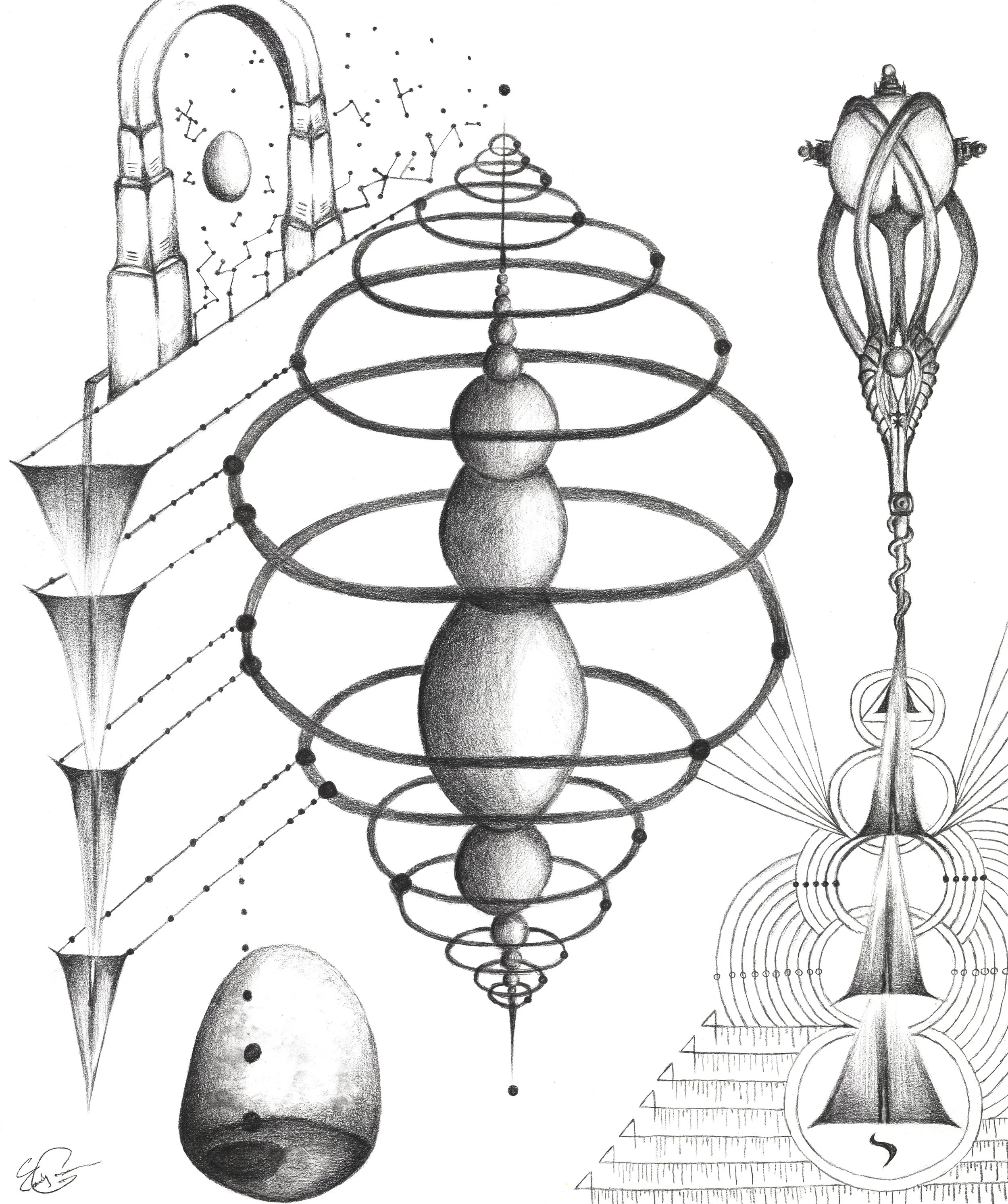 An exploration of how awareness organizes itself around a core. Rings, nodes, and trajectories describe a quiet choreography—energy gathering, circulating, and refining. Organic volumes interrupt strict geometry, reminding us that precision and intuition coexist. What appears mechanical is tender; what appears abstract is deeply physical.