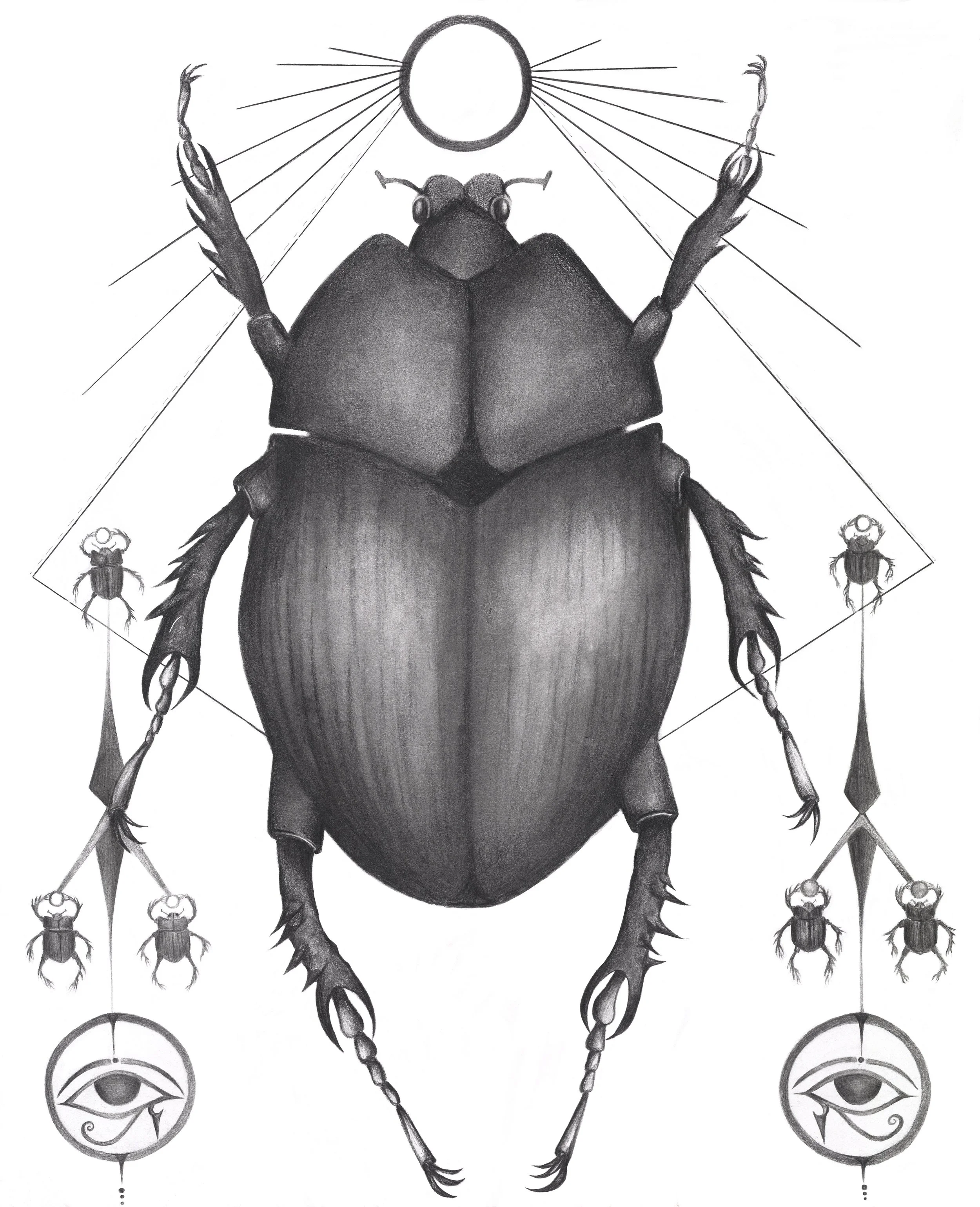 The scarab moves between earth and sky, carrying with it an ancient symbolism of renewal and transformation. Guided by the stars — just as dung beetles navigate by the Milky Way — it rolls its path across both soil and cosmos, mirroring the eternal cycles above. In this drawing, geometric precision and sacred symmetry merge with organic form, turning the beetle’s body into a vessel of constellations. The Celestial Scarab reminds us that even the smallest of creatures is aligned with the vast rhythms of the universe, a fragment of infinity in motion.
