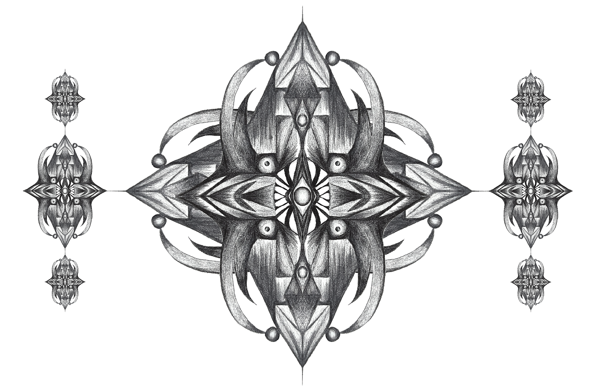 the scarab moves between earth and sky, carrying with it an ancient symbolism of renewal and transformation. guided by the stars — just as dung beetles navigate by the milky way — it rolls its path across both soil and cosmos, mirroring the eternal cycles above. in this drawing, geometric precision and sacred symmetry merge with organic form, turning the beetle’s body into a vessel of constellations. the celestial scarab reminds us that even the smallest of creatures is aligned with the vast rhythms of the universe, a fragment of infinity in motion.
